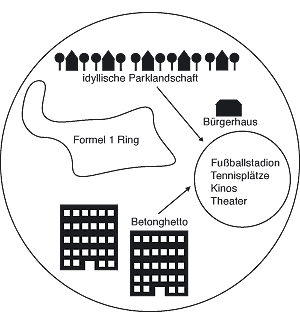 generell planen würde, so wie sie für mich ideal wäre, würde ich zunächst mal keine Ghettos zulassen. Also keine Elitegettos oder Arbeitersiedlungen. Das würde ich nicht machen, weil gemischt ist alles besser. Da fühlt sich auch keiner unterdrückt, nur weil er ein bisschen weniger verdient. Für eine Umfrage würde ich es interessanter finden, wenn die einzelnen Personen isoliert voneinander leben