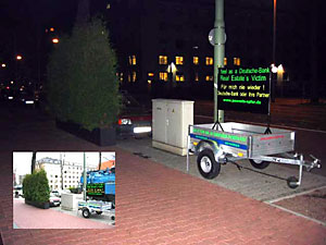 Daraufhin stellte Frank Schmall einen von Dieter Leichner, einem Leidensgenossen, angemeldeten Anhänger neben die Koniferen-Wand. Dieser Anhänger war ebenfalls beschriftet und mit einem Schild beladen, dass außer mit einem Hinweis auf das Auto auch mit Protestschriftzügen in deutscher und englischer Sprache versehen.