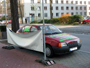 Zunächst wurde das Protestfahrzeug mit Motorrädern und Fahrrädern umstellt. Da dies nicht den gewünschten Effekt brachte, stellte die DWS bald danach ein Gerüst mit einer Plane auf um das Auto zu verdecken. Auch dieser Versuch blieb nur ein Zwischenstadium.