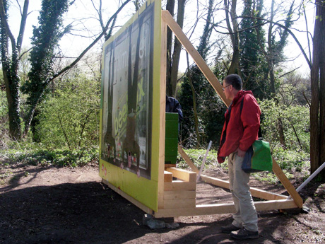 Die auf dem IWZ-Grundstück (= Internationales Waldkunst Zentrum / Darmstadt, Kuratorin Ute Ritschel) aufgestellte Plakatwand simuliert die Ansicht des demnächst in Frankfurt eröffnenden Delikatessladens "beespace", vor dem die Künstler Florian Haas und Andreas Wolf kopfstehen. Ihre geöffneten Münder dienen den hinter der Werbefläche behausten Bienen als Einflugloch. Kein Klamauk, sondern historischer Bezug verbirgt sich hinter der skulpturalen Insektenwohnung: Vorbild sei der heilige Ambrosius, so Andreas Wolf. Diesem seien Bienen durch Mund und Körper gezogen, um dort ihren Honig zu hinterlassen. Mit seiner "honigsüßen Rede" habe der Heilige konsenssteigernd auf die Kirche gewirkt. Mit Ideen und Aktionen gestaltend auf die Gesellschaft einwirken, dazu will die "Stadtimkerei finger" anregen.