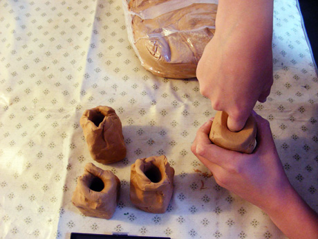 In der Zwischenzeit, während das Wachs langsam auf einer Heizplatte erhitzt wird, bereiten die Kinder jeweils ihre Form für ihren Wachstift vor. Hierzu bekommen die Kinder je ein etwas größeres, möglichst weiches und feinkörniges Stück Ton, das sie zu einem Quarder formen. In diesen Quarder hinein stecken sie dann einen Finger, vorzugsweise den Zeigefinger, denn in dem haben sie häufig die meiste Kraft, und ziehen ihn, ohne ihn viel hin- und her zu bewegen vorsichtig wieder raus. (Wenn die Kinder noch zu klein bzw. zu schwach sind, kann natürlich auch irgend etwas anderes in Form eines Stiftes in den Ton gesteckt werden.) Die so entstandene Form�wird dann mit der Wachs-Pigment-Mischung gefüllt und bleibt zum Abkühlen für ca. 8 Minuten stehen.