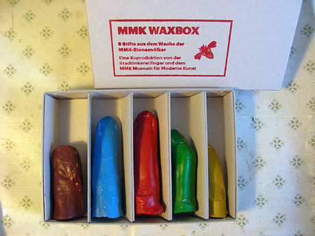 Ausserdem konnten sich Kinder, wie auch erwachsenen Besucher des Honigfrühstücks 2010 aus dem Wachs vom Dach des Hauses erstmals eigene Wachsmalstifte erstellen, die sie in der MMK-WAXBOX mit nach Hause nehmen konnten.�